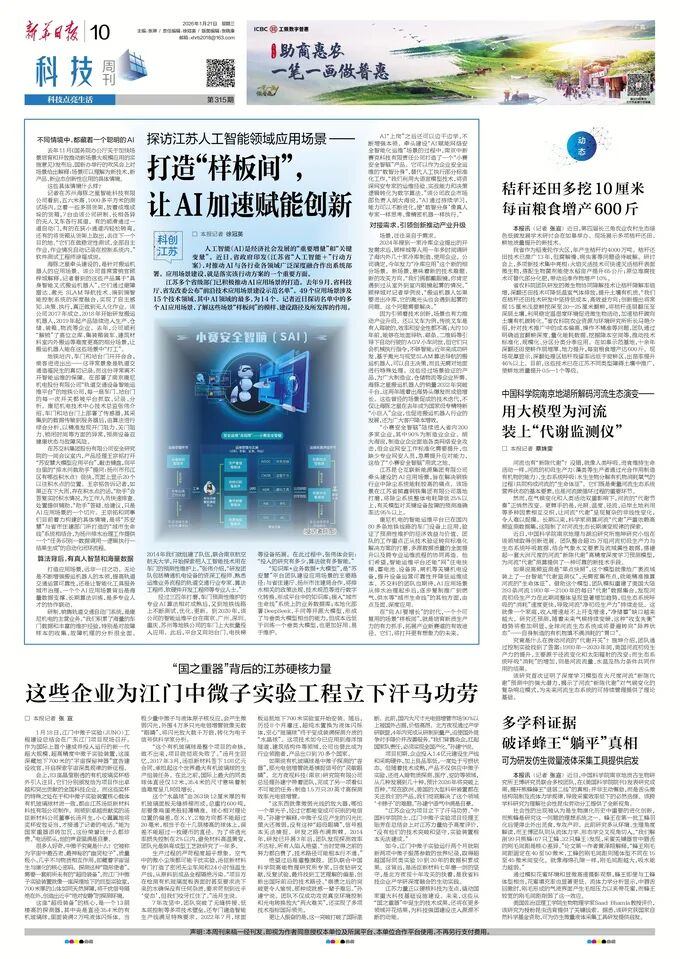 2026年1月21日,《新华日报》以《探访江苏人工智能领域应用场景——打造“样板间”, 让AI加速赋能创新》为题,报道了jiuyou.com等入选江苏省“前沿技术应用场景建设示范名单”企业,在应用场景建设方面的实践与成效。